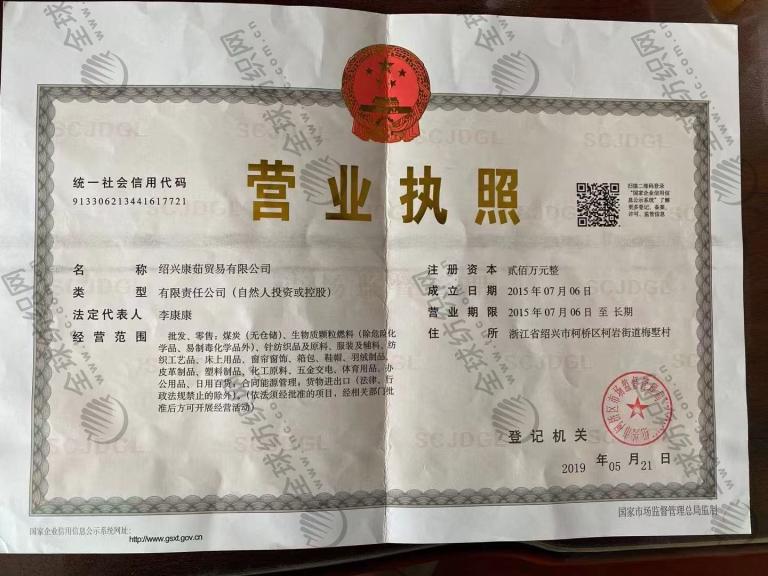 | 统一社会信用代码/营业执照注册号: | 913306213441617721 | 名称: | 绍兴康茹贸易有限公司 |